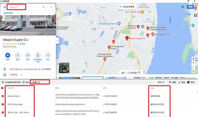 ● 一键搜索目标区域的商家信息,包含公司名称、所属行业、网址和手机;