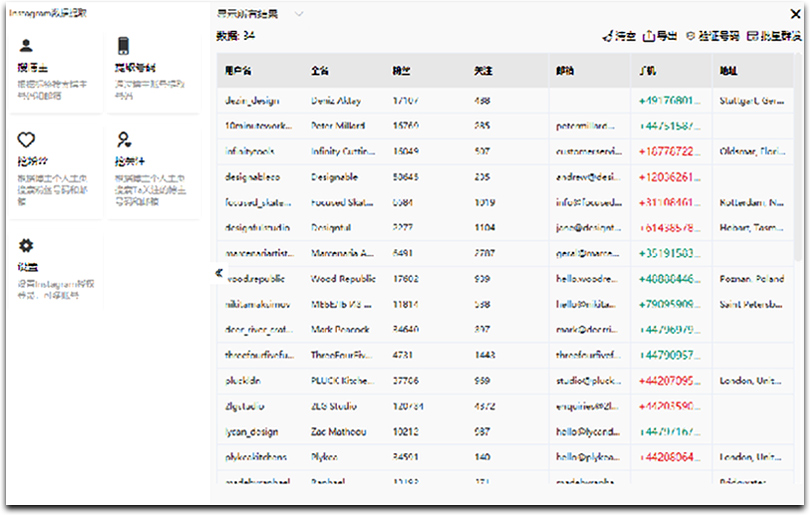 ● 采集Facebook、Instagram、Linkedin、Twitter、YouTube等海外10多个主流社媒平台的海外客户名称和电话号码